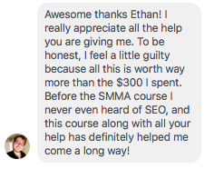 Read MoreI didn't even hear about what SEO was till shortly before buying this course. This has proven to be an invaluable resource. Ethan has proven to be a very attentive teacher through all this. He absolutely has went out of his way to answer every single question I have had. Ethan's consultation alone is worth way more than I have paid for the course! Can't recommend it enough!